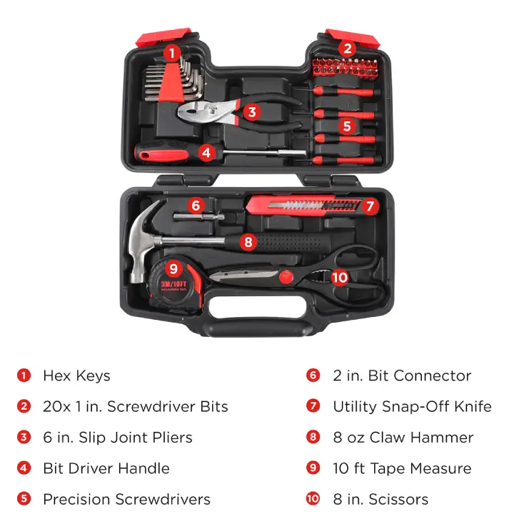 - Complete 39-piece household tool kit designed for everyday repairs and DIY projects