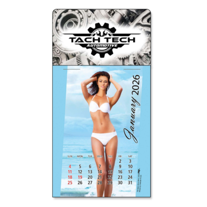 Hand out like a business card Swimsuit-Themed Adhesive Peel-N-Stick® Calendar – Personalized. Great for car dealers, repair shops or anyone you want to get their attention