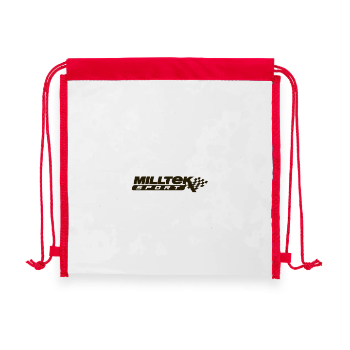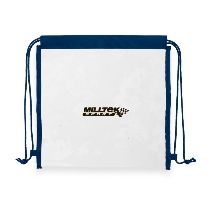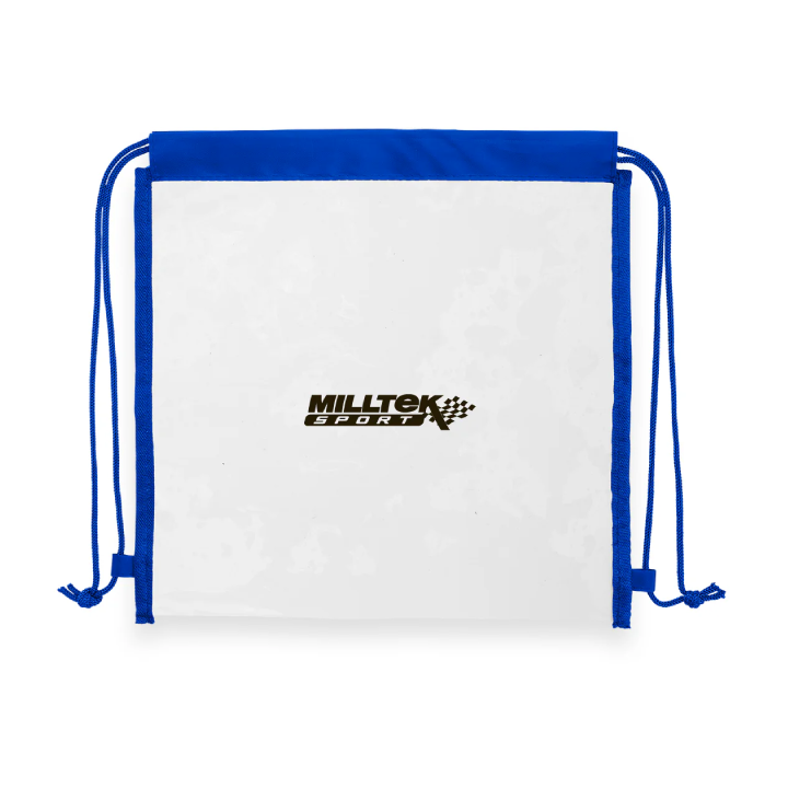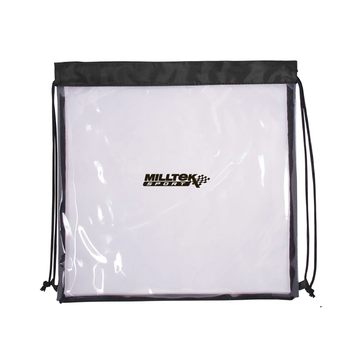 - Clear 0.3 mm PVC drawstring backpack with black non-woven trim.