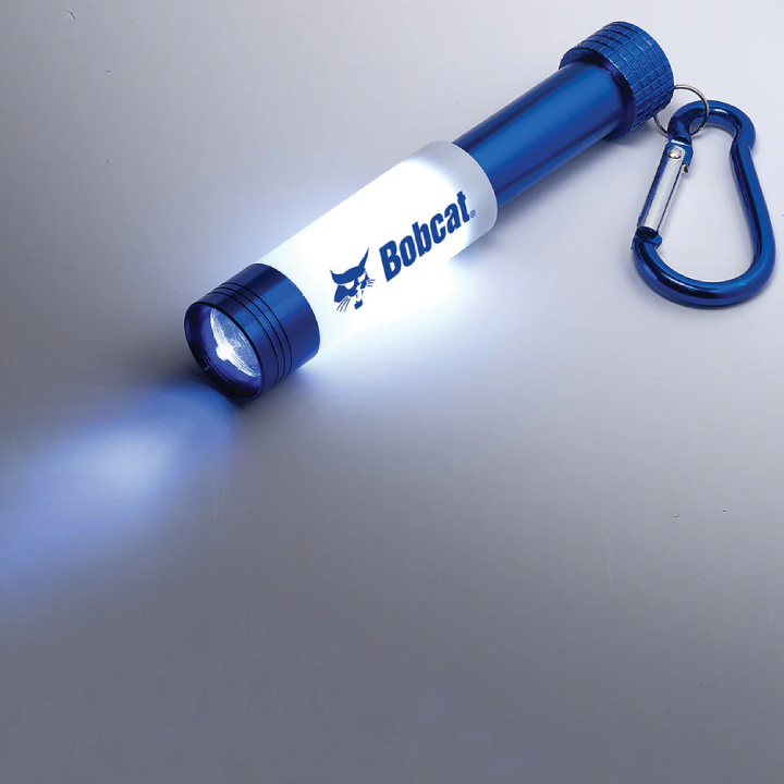 Be Seen Expandable LED Light Expandable telescopic flashlight made of ABS Plastic with Aluminum end panels and carabiner (carabiner measures approx. 1.65"l). Uses 4 button cell batteries (LR44), included and replaceable. On/off button or light up by exte