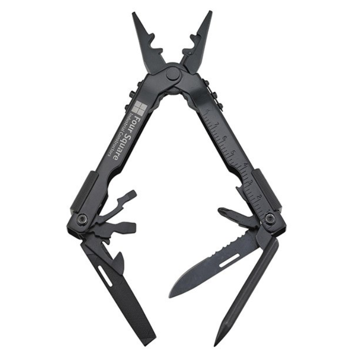 - Features include: plier with nail remover, serrated blade, multiple screwdrivers, bottle/can opener, reamer, saw, nail file and ruler.