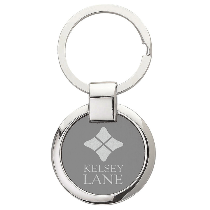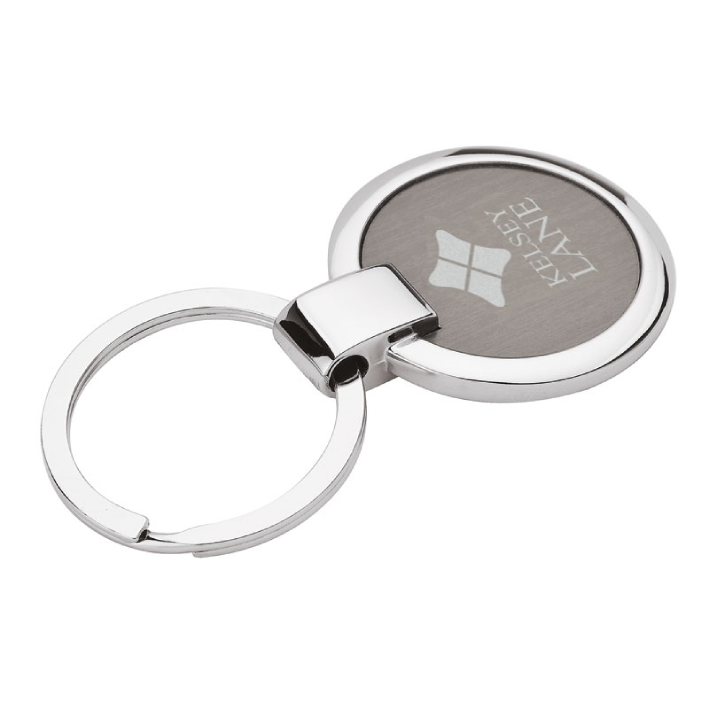 - Round keyring with split ring, shiny nickel finish and a brushed gunmetal plate.