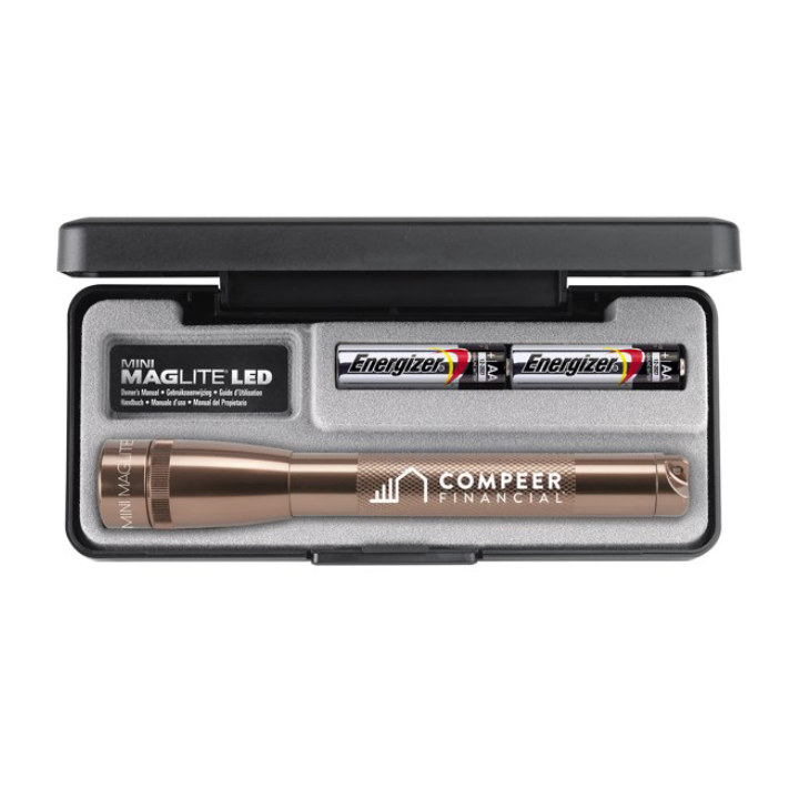 "The 2 'AA' LED Mini MagLite® comes packaged in a sleek black presentation box, making it an ideal choice for awards, corporate gifts, and special occasions. Its compact design and powerful LED beam combine style, function, and convenience