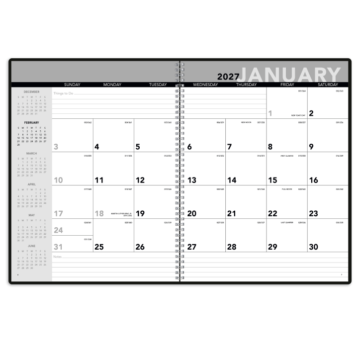 - One month on each two-page spread, along with six months on left column and ample space for notes.