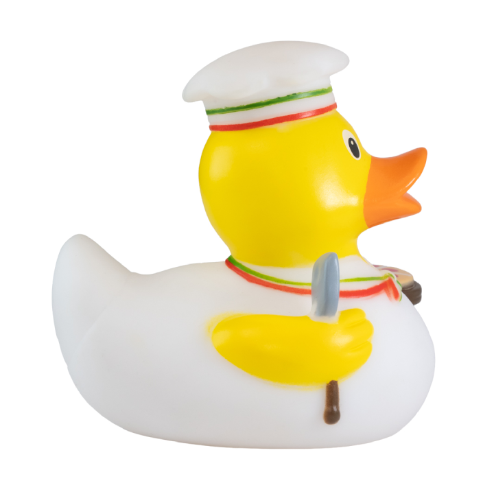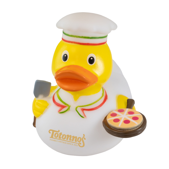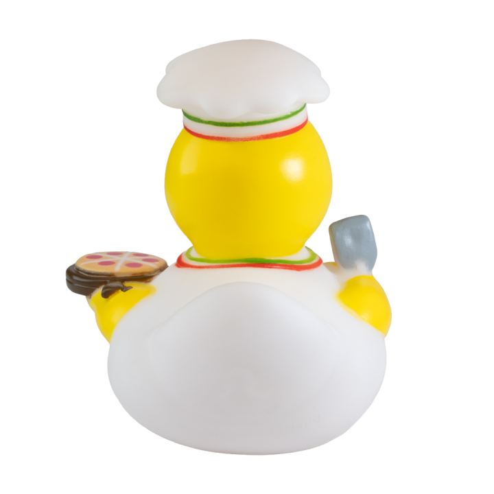 - The Pizzaman Rubber Duck brings delicious charm to your promotions with its chef hat, apron, and signature pizza slice.