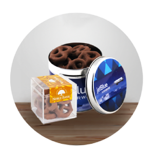 Browse our full selection of custom food gifts including candy gifts, chocolate treats, gourmet cookies, gift baskets, mints, popcorn, pretzels, nuts, and snack packs designed to create memorable promotions and delicious corporate giveaways.