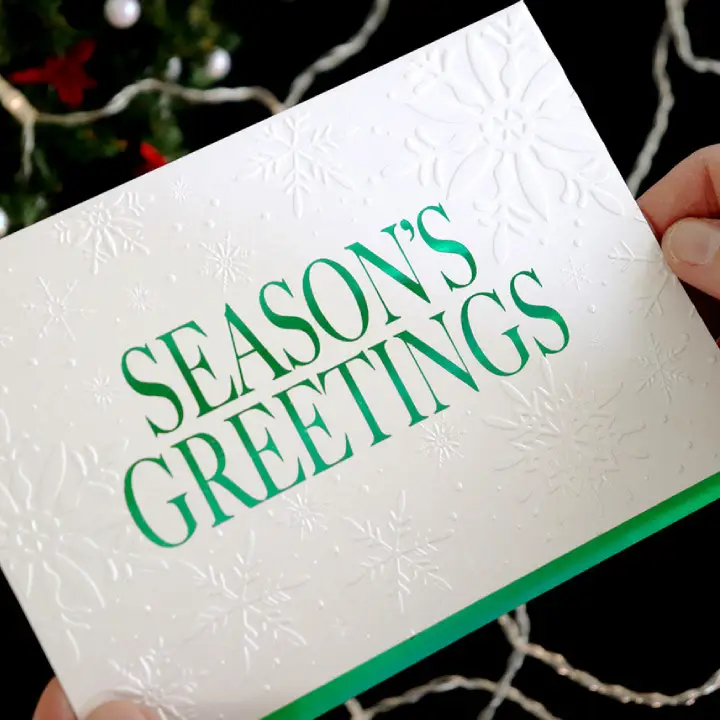 A subtle Christmas card design with a bit of wintry shimmer. Embossed snowflakes on pearlescent paper stock with green holographic foil accents are reminiscent of a serene winter scene.