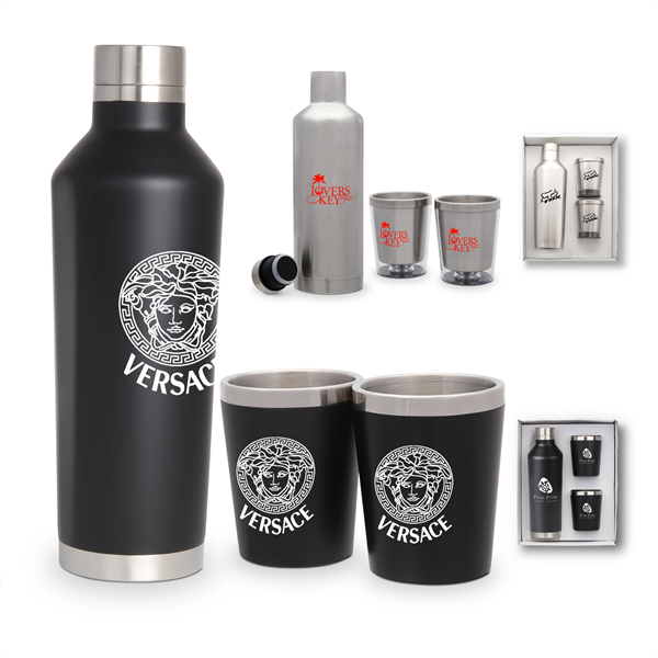 Can't Beat this great drinkware Gift. First color/side imprint on bottle + both tumblers included